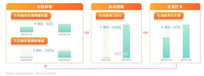 基于此,平台内形成了先进行内容“种草”,继而转向“购买团购”,最终“实地打卡”的综合体验流程。这个流程以更短、更高效的消费链路推动用户交易。据统计,从2021年1月到2022年1月,生活服务GMV增长234倍,生活服务打卡量在同期也增长了63倍。