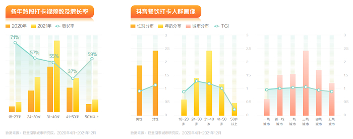 这部分群体在消费之后将线下美食经历发布于抖音上,从“拔草人”转化为新的“种草人”。其中31-40岁人群是传播主力,但数据显示50岁以上人群也开始涌进餐饮体验的打卡潮流之中,视频数据在近一年开始翻倍,TGI(目标群体在特定研究范围内的强势或弱势)指数猛增。