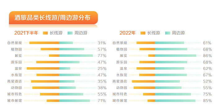 其次针对酒旅行业,该报告强调目前长线游遇冷,周边游升温,户外游览项目受欢迎。相比2021年下半年,2022年初自然景观周边游交易额占比由31%上升至61%,植物园、展览等周边游交易额占比则分别从57%、77%上升至68%、86%,增势明显。