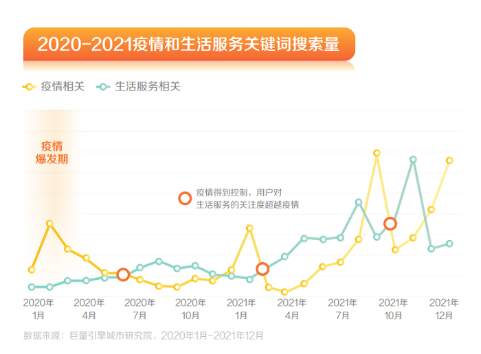 《报告》中特以西安为例来论证。在2021年11月到2022年2月西安疫情爆发时期,疫情和生活服务相关的搜索量在疫情前后呈现“此消彼长”的趋势。当2月份当地疫情得到有效防控时,用户对于生活服务相关的搜索量达到56%的增长。