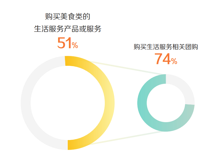 首先对于餐饮行业,该《报告》指出数字化生活已成趋势,用户养成线上购买团购再进行线下消费的习惯。数据显示,有51%的用户表示“平常会购买美食类的生活服务产品或服务”,在这些用户中,则有74%的人平时有购买生活服务团购的习惯。