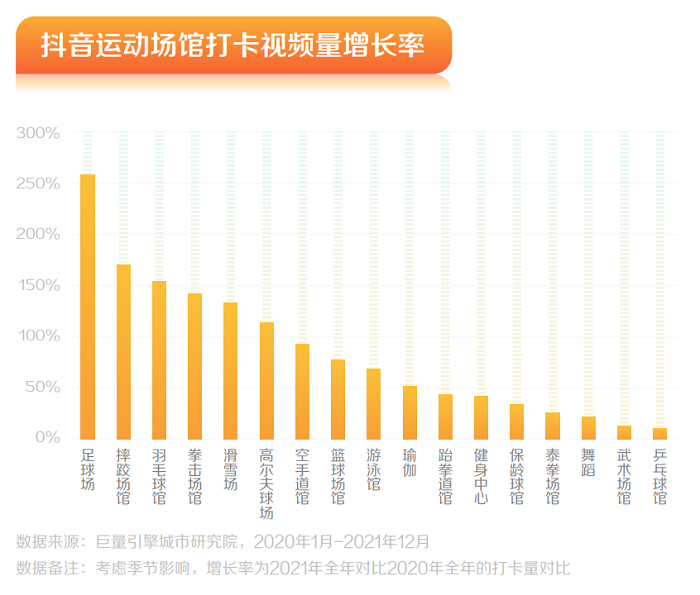 最后在到综行业,该《报告》显示健康运动、丽人休闲的需求扩大,更为多元。足球场、摔跤场馆、羽毛球馆的热度显著增加,相比2020年,2021年在足球场打卡量增速更是高达250%。尤其是2022年冬奥会带动了滑雪运动在国内的热度,滑雪场的打卡量增长率达140%。
