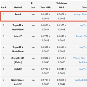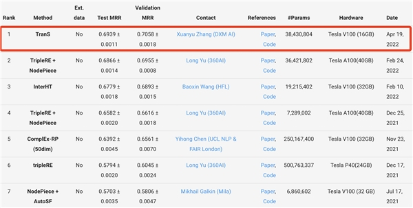 就在近期最新一轮的知识图谱实力“角逐赛”中,度小满团队凭借自创的TranS 模型占据榜首。与之同台竞技的对手包括深度学习三巨头、图灵奖得主LeCun、Yoshua Bengio坐镇的Meta FAIR实验室和MILA实验室,还包括360、蚂蚁金服、第四范式等耳熟能详的国内大厂。