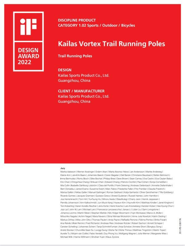 本次德国柏林举办的这场群英集结的If设计奖赛中,凯乐石再次带来品牌自主创新产品——Vortex旋风越野手杖,凭借其轻量化的外形结构、平衡省力、不易老化的产品优势,获得了If设计奖独立评审会的一致认可。 这款独特新颖的产品从57个国家/地区所提交的总共约 11,000 件参赛作品中脱颖而出,一举斩获iF设计大奖。在这款Vortex旋风越野手杖中,杖杆部分采用T700级高强度碳纤维,保证了质轻高强,不易老化的特点。其中所采用的创新旋钮式索锁系统,更是得到了国家发明专利。将设计与科技相结合,展示了凯乐石深耕户外、注重消费者体验的品牌理念以及出众的产品设计能力。