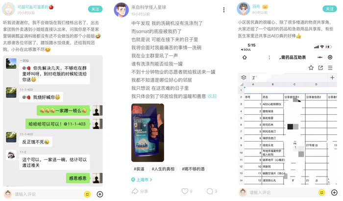 “洗碗机没洗涤剂了,我在业主群里吼了一声,不到十分钟物业的志愿者就送来了一罐。我不知道这来自哪位好心的邻居,我只想说,在这样特殊的日子里,我只体会到邻居给我的温暖和善意。”一位来自科学怪人星球的Soul用户说。