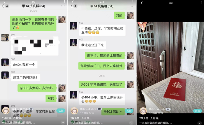 而这只是当下邻里间守望互助的一个缩影。3月以来,全国多个地区相继进入居家生活状态。特殊时期,一些不便困扰着大家。这时,互帮互助的举动就时刻在邻里间上演着,人们或互相投喂、分享珍贵的物资,或挺身而出、相互支援。