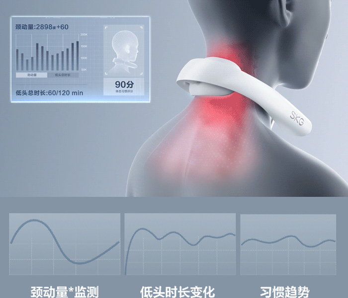 SKG K5 Pro作为首款搭载颈椎健康Al管理系统的按摩仪,在实现传统的按摩功能之外,还可以通过加速传感器捕捉颈部动作,统计颈动量以及监测低头时长,甚至可以测试颈椎体态状况,是很受欢迎的具备人性化设计的产品。