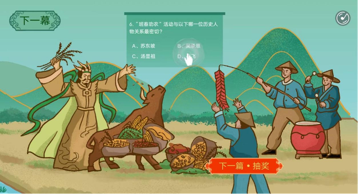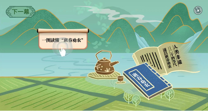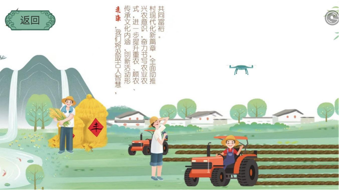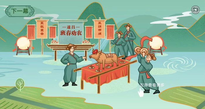 以“尖上的‘指班春劝农’”—人类非遗助力共同富裕为主题的非遗文化活动“班春劝农”主要分为“一图读懂|人类非遗·二十四节气·班春劝农”和“班春劝农”云体验互动游戏两大部分内容,目的在于充分利用互联网技术,让更多的人易于接受、便于参与,进一步提升活动的影响力,以全新的模式与新鲜的玩法呈现,让“班春劝农”在新时代焕发新活力。