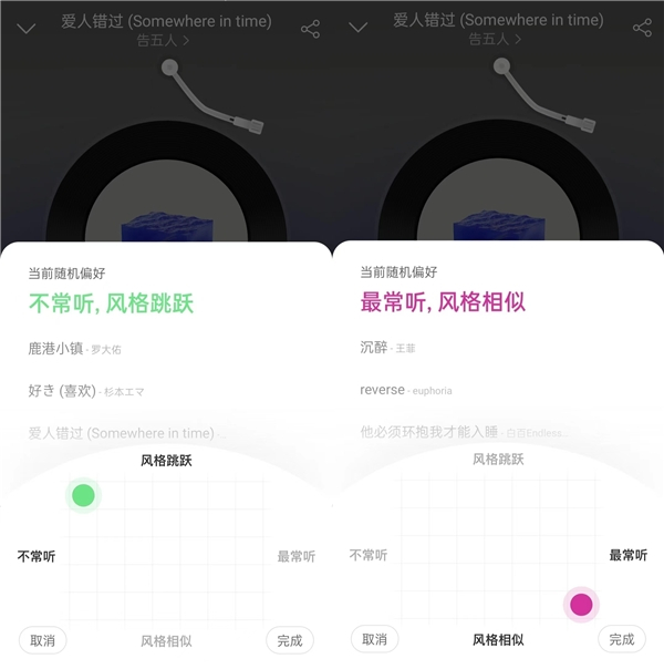 传统的“洗牌随机”类似“洗扑克牌”,一定程度上满足了用户基础的随机播放需求,但仍无法解决每个用户的差异化需求。例如有用户希望歌曲风格更连贯,但也有人希望歌曲风格能有更多差异化,有人希望能优先听到自己近期喜欢的歌,有人希望能在历史歌曲中发现惊喜。因而,随机播放进一步发展的方向是更具用户掌控感的自定义随机播放模式。