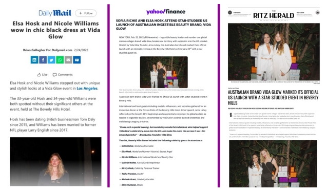 经过香奈儿指定美容护肤专家、贝嫂御用美容师Melanie Grant美容院举办的奢华沙龙,比佛利山庄酒店举办的盛大VIP晚宴和纽约传奇地标卡莱尔红木酒店的媒体见面会三场盛大活动,Vida Glow海洋胶原蛋白受到了当地名流贵宾的热烈欢迎,Vida Glow品牌热度受到媒体争相报道。
