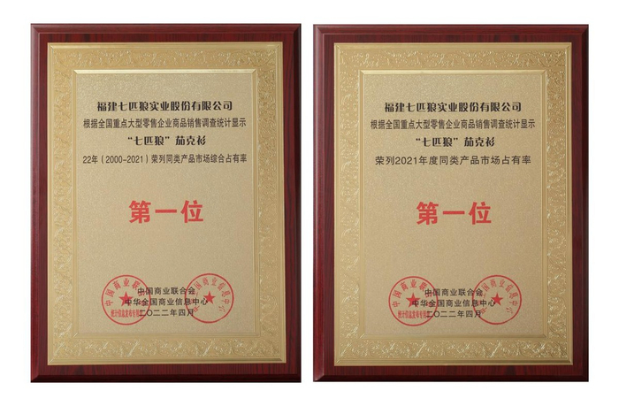 在不久前结束的中国商业联合会、中华全国商业信息中心联合主办的“2022(第三十届)中国市场商品销售统计结果发布会”上,根据全国重点大型零售企业商品销售调查统计显示,七匹狼茄克获得“2021年度同类产品市场占有率第一位”和“连续22年(2000-2021)荣列同类产品市场综合占有率第一位”双料殊荣。会议上,七匹狼还荣获“2021年度中国消费品市场销售领先品牌”,是当之无愧的中国“茄克之王”。