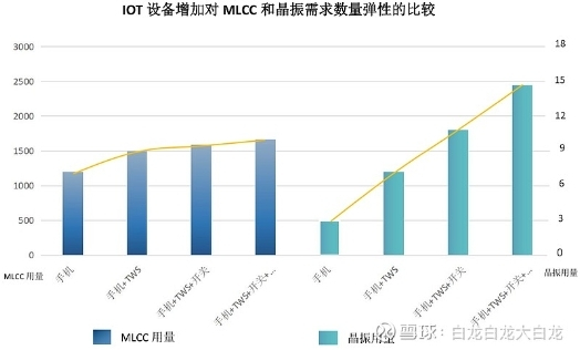 从柱状图可以看出,对于阻容感这种元器件来看,手机绝对是定海神针般的存在,物联网的需求对阻容感的用量拉动是微乎其微的,500个智能开关的MLCC 用量才相当于1部手机。而晶振,则恰恰相反,手机显得略有些“微不足道”,物联网终端才是核心驱动力 。1个智能开关的用量就相当于1部手机。