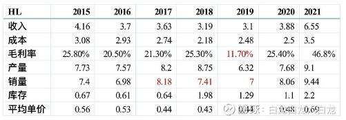 由于缺少产品结构数据,HL平均单价的波动确实不太容易解释。比如2017-2019年,销量下滑,毛利率大幅下滑,但是单价持平。感觉有点像上游原材料涨价,但是没能向下传导。但是2018年平均单价不变,毛利率大涨确实又让我想不明白。总之,HL的报表数据让我确实有很多疑问。