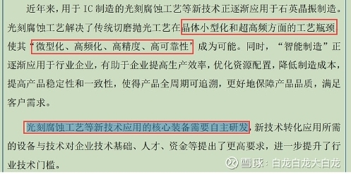 我有幸参观过泰晶的光刻产线,一条产线大概包含40多道工序,虽然跟半导体产线的复杂度没法比,但是有点类似,哪个环节蒸镀、哪个环节加什么气体,哪个环节用什么腐蚀药水清洗等等,没有标准化的工艺,自研工艺需要自研(或自己设计)设备来支持,非常依赖积累。