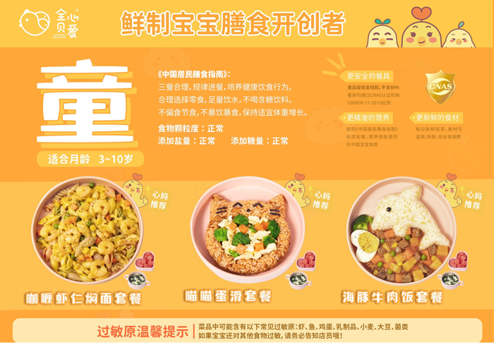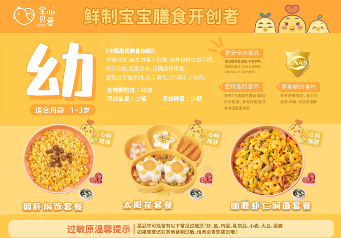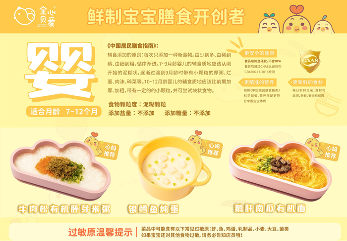 南京全心贝爱餐饮管理有限公司作为该团体标准起草单位,深入探索的同时积极推广该标准中的各项规定,引领行业升级。此外,2022年5月,全心贝爱参考《中国居民膳食指南》和2007年中国营养学会妇幼分会制定的《中国孕期、哺乳期妇女和0-6岁儿童膳食指南》中针对0-6个月、6-12个月和1-3岁不同年龄段婴幼儿的膳食宝塔纲要,研发的“婴、幼、童”三阶鲜制宝宝膳食营养餐,更加系统性定义“鲜制宝宝膳食”。