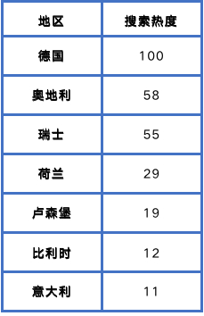 3. 在全球范围内,欧洲消费者对电动自行车最有搜索热情,其中又以德国、奥地利、瑞士三个国家的热度为最高。第二梯队主要集中在其他的欧洲各国和北美地区;在东南亚地区的搜索热度则垫底。
