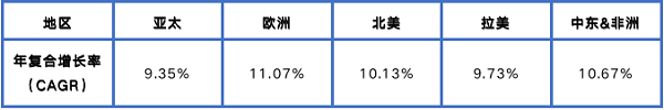 根据上表,以2021年为基准进行计算,我们得到全球各市场年复合增长率如下表所示: