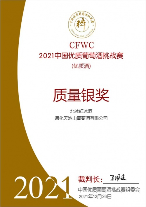 2021年生产的“北冰红冰酒”获得“中国优质葡萄酒挑战赛(优质酒)质量银奖”;