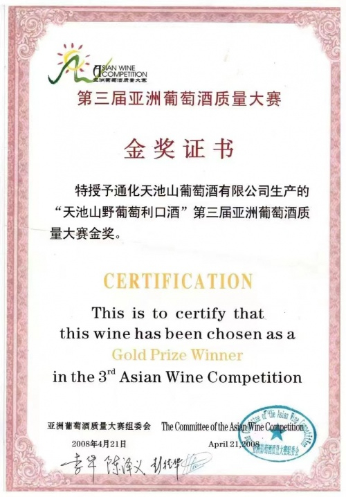 2008年4月第三节亚洲葡萄酒质量评比大赛中“山葡萄利口酒 ”获得“亚洲金奖”;