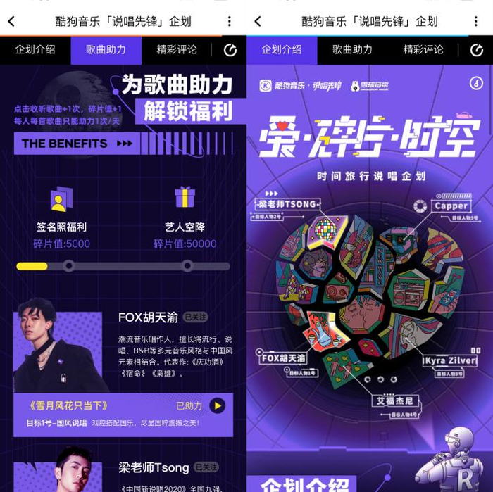 《爱·碎片·时空》时光旅行说唱企划是酷狗“说唱先锋”IP的重要尝试。在中文说唱逐渐定型之际,“说唱先锋”意图通过召集一群年轻rapper来弘扬中文说唱文化。不断在内容和形式层面作出创新,以此从更深层次梳理说唱文化在音乐平台的构建路径,为华语乐坛打造更多热门说唱。