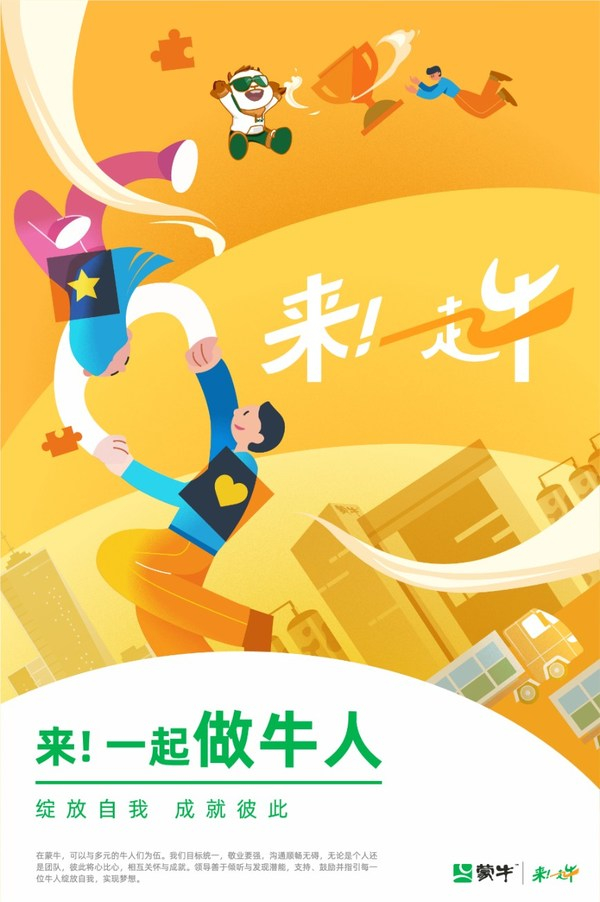 5月4日,蒙牛集团发布了全球雇主品牌,以及"来!一起牛"的雇主价值主张(EVP)。恰逢五四青年节,23岁的"青年"蒙牛发布的EVP,充满激情与活力,也彰显其对全球优秀人才的期待和渴望:希望更多牛人加入蒙牛,一起去追求更牛的目标。