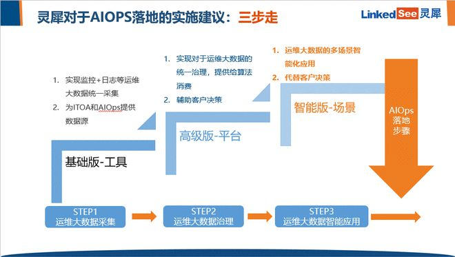 第3步:也就是2019年才正式开发平台之上的AI场景型产品-智能故障溯源。至此灵犀已经通过综合的技术储备,推出了能够支持中国市场各个不同数据现状的客户,可以带给客户端到端运维数据流转闭环的用户体验。