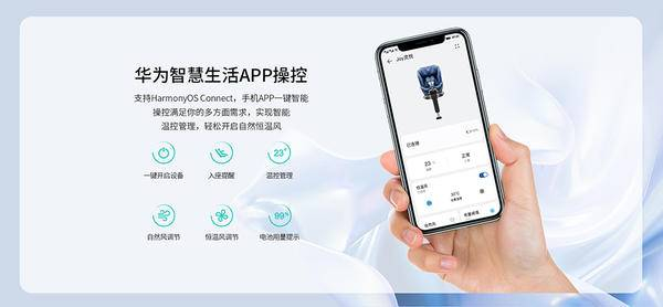 ·用华为智慧生活APP就可以进行一键智能操控。 重力感应系统、智能温控管理、可根据所需启动恒温风或自然风模式,满足宝宝舒适体感需求等,为宝宝舒适坐感保驾护航。