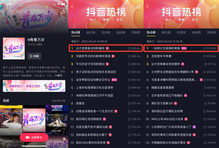 每代青年都有着自己定格青春模样的方式。今年青年节,抖音成为了新时代年轻人们展示朝气与活力,定格多彩模样的青春舞台。#青春万岁 话题活动引发了媒体、高校、名人和用户们的广泛关注与参与,截止5月5日,该话题投稿数达453.4w个,总播放量突破75亿。活动话题#这才是青春该有的模样和#一张照片定格我的青春 均登上抖音热榜TOP1。