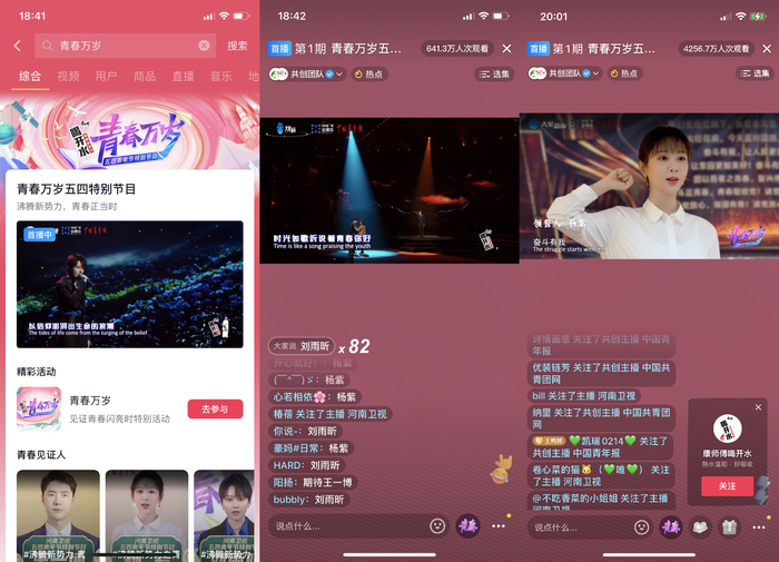 直播当日,基于节目拆条衍生青春燃向热词和众多节目热点全面绽放,在站内营造了浓厚的青春氛围感。5月3日至4日期间,抖音还延续青春万岁主题,联动河南卫视、青蜂侠、河南春晚官方与节目主创团队、青年艺人代表,发起多场连麦直播,畅聊节目录制趣事和回忆青春。此外,与大象新闻独家共同策划打造的抖音现场版青春歌会更是吸引了众多用户留言点歌互动。