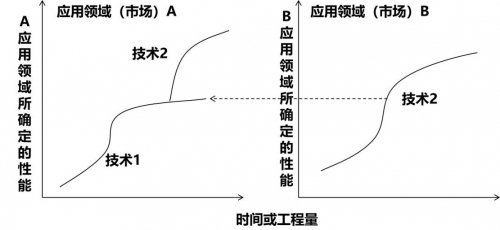如上图,左边轴线图中,企业在市场A中通过技术1,积累了越来越多客户,带来了可观的利润,但发展规模变大,也会伴随着出现技术饱和的情况。而右边轴线图中通过一个具有破坏性创新的技术,在应用市场B取得新的发展路径,这代表一个新兴市场,它们积累了新的客户后获得了利润,就会逐渐迁徙到A市场发展,通过其破坏性技术创新来满足市场A原有的客户群体,也就让技术2快速迭代至技术1之上而发展,以此来继续为企业带来新的增长点。比如说手机APP与微信小程序。手机APP代表左图的技术1,根据工信部公布的2021年我国移动应用程序(APP)发展情况,截止到2021年12月底,我国国内市场上的手机APP数量为252万款。手机APP数量如此庞大,几乎覆盖了我们生活的方方面面。每个企业开发不同的APP,并且不断地升级APP版本,似乎都是希望能够建立自身的流量池,让客户更加长期地留在自身的某个业务市场中。但我们手机的容量有限,面对这么多的APP,用户的使用习惯是不希望APP占据手机容量,所以企业也不容易维持着这部分用户长期用他们开发的APP。而微信小程序则是首先代表右图的技术2,微信小程序可以解决省去用户下载APP占据手机容量的痛点,所以很多企业开始把手机APP的功能,嫁接到微信小程序中,双方似乎也不会产生竞争冲突。但往深一层思考,目前5G技术发展越来越快,其万物互联的速度会变得非常之快,用户有可能会变得越来越习惯于用微信小程序来完成一系列APP才能完成的业务流程动作,若到了这个发展程度,就是右图的技术2逐渐转变到左图的技术2当中,抢占了开发手机APP的市场份额了。