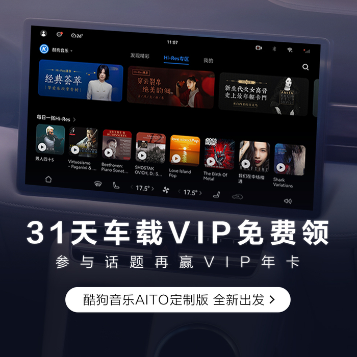 那AITO问界M5车主如何下载并使用【酷狗音乐AITO定制版】呢? 出厂新车可在“服务与应用—应用中心—华为应用市场”中找到酷狗音乐进行下载;已使用的汽车可升级至最新系统后,酷狗音乐已预装至车机系统中,可在首页音乐卡片位切换使用。此外,车主们只需在“AITO车机端-酷狗音乐-我的-会员中心”点击活动图,通过微信/支付宝扫码即可领取31天酷狗音乐车载VIP会员权益,限量活动,派完即止。还等什么赶紧来酷狗音乐,体验一下【酷狗音乐AITO定制版】带来的听感快来吧!