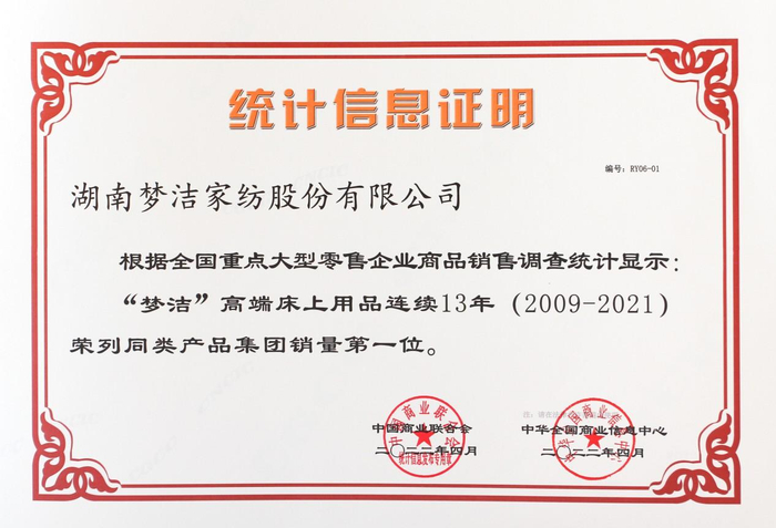 得益于品牌高端战略升级的坚定推进,近日,在由中国商业联合会、中华全国商业信息中心联合举办的中国市场商品销售统计结果发布会上,根据全国重点大型零售企业商品销售调查统计显示,梦洁高端床上用品连续13年(2009-2021)荣列同类产品集团销量第一位,荣获“连续13年高端床品全国领先”战略证书。