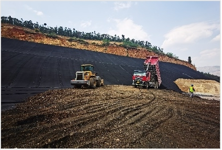 工程包括渣场、调节池、渗滤液处理站、管理房等主要设施。渣场总库容约986万m3。渗滤液处理设施处理能力130 m3/d,处置场运行期间生产管理用房约600m2。渣场内设置地下水导排系统、水平防渗系统、渗滤液导排系统、清污分流系统等。渣场汇水面积约0.74km2,拦渣坝顶高程1260m,最终堆积高程1410m,总坝高约185m。渣场分三期实施,从库尾开始建设使用,工程于2018年3月开工建设,2019年3月完成一期建设(完成库容325万m3及渣库配套的调节池、渗滤液处理站、管理房等设施建设)并投入试运行。