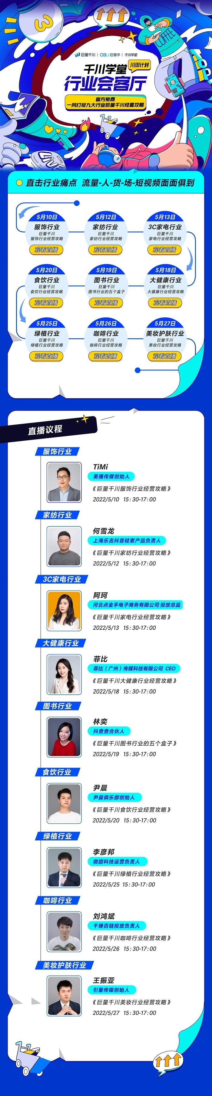 5月10日起至5月27日,千川行业会客厅将陆续推出面向服饰、家纺、3C家电等九大行业的直播课。
