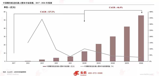 报告指出,过去五年中国餐饮配送机器人行业规模已从2017年的0.2亿元增长至2021年的6.0亿元,年复合增长率为134%。未来将持续提升,有望从2022年的12.1亿元增长至2026年的55.7亿元,年复合增速为46.4%。包括国家政策颁布、中国劳动人口减少、零部件国产化、从业人才红利等在内几大驱动因素,是推动餐饮配送机器人快速发展的核心动力。