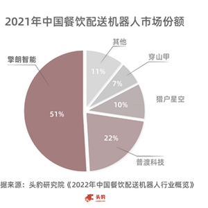 5月7日,知名分析机构及大数据平台头豹研究院发布《2022年中国餐饮配送机器人行业概览》,最新数据显示,在2021年中国餐饮配送机器人市场中,擎朗智能已抢占一半份额稳居第一,市占率达51%,是第二名的两倍以上,领头羊优势明显。