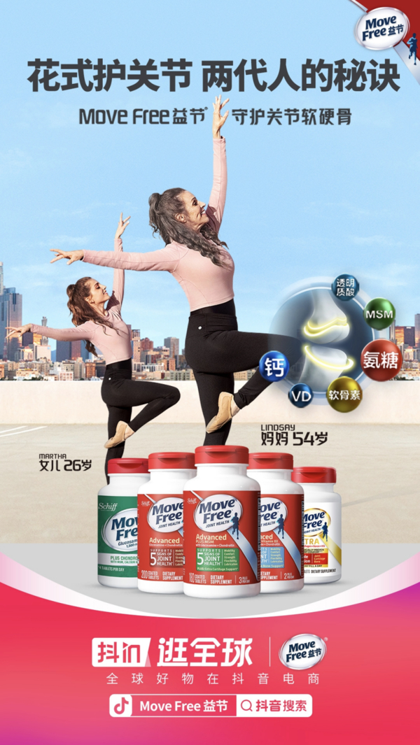 而作为Move Free益节的重要合作伙伴,抖音集中优势资源赋能品牌,多年来双方深入合作,在抖音直播领域上不断提升消费者的购物体验,通过抖in逛全球活动为消费者打造健康的生活品质。