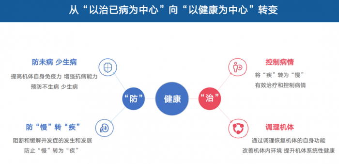 何月蓉院士提出,新时代的中医现代化,要从“以治已病为中心”向“以健康为中心”转变,要做好“防”与“治”。“防”就是提高机体自身免疫力,增强抗病能力,不生病、少生病,阻断和缓解并发症的发生和发展,防止“慢”转为“疾”;“治”是将“疾”转为“慢”,有效治疗和控制病情,并通过调理恢复机体的自身功能,改善机体内环境,提升机体系统性健康。