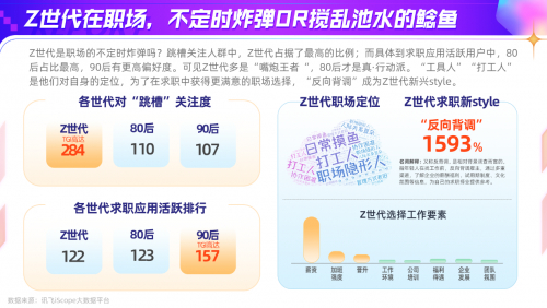Z世代是职场的不定时炸弹吗?跳槽关注人群中,Z世代占据了最高的比例;而求职应用活跃用户中,80后占比最高,90后有更高偏好度。但Z世代确实普遍不满于自己的职场生活,“工具人”、“打工人”是他们对自身的定位,为了在求职中获得更满意的选择,“反向背调”成为Z世代新操作。