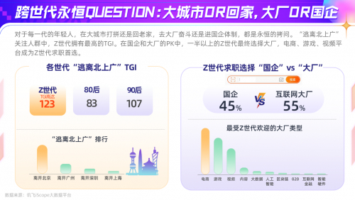 每一代的年轻人,在大城市打拼还是回老家,去大厂奋斗还是进国企体制,都是永恒的拷问。《报告》显示,“逃离北上广”关注人群中,Z世代拥有最高的占比和TGI。在国企和大厂的PK中,一半以上的Z世代最终选择大厂,电商、游戏、视频平台成为Z世代求职首选。