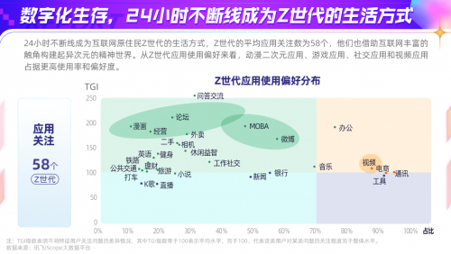 24小时不断线是互联网原住民的生活方式,Z世代平均使用应用个数高达58个。《报告》发现,从Z世代应用使用偏好来看,动漫二次、游戏、社交和视频应用占据更高使用率和偏好度。
