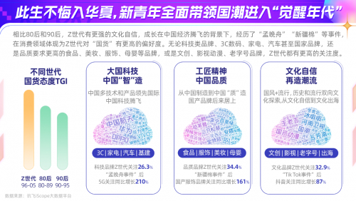 成长在中国经济腾飞的背景下,Z世代有更强的文化自信,在消费领域对“国货”有更高偏好。无论科技品牌、3C数码、家电、汽车甚至国家品牌,还是食品、美妆、服饰、母婴等品牌,或是文创、影视动漫、老字号品牌,Z世代都有更高的关注度。