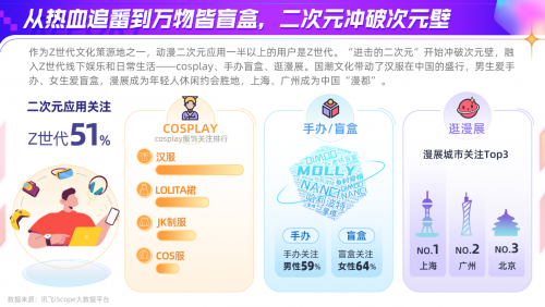 作为Z世代文化策源地之一,动漫二次元应用一半以上的用户是Z世代。Cosplay、手办盲盒、逛漫展……“进击的二次元”开始冲破次元壁,融入Z世代线下娱乐和日常生活。国潮文化带动了汉服在中国的盛行,男生爱手办、女生爱盲盒,上海、广州成为中国“漫都”。