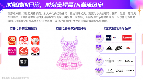 在穿搭方面,Z世代风格多变,从大众化的运动休闲、复古和法式风,到更小众的嘻哈、国风、欧美、原宿风全部拿捏。根据《报告》,Z世代使用率Top的购物应用为淘宝、拼多多和京东等,但偏好度Top的却是以潮牌、运动休闲为主的得物。相比大众服饰品牌和快时尚品牌,深谙chill风的Z世代更加偏好运动服饰和潮牌。