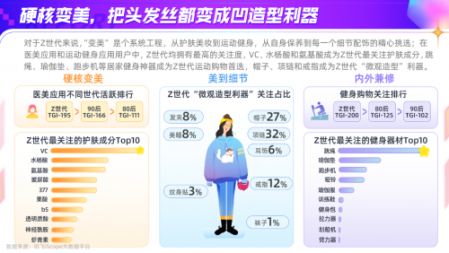 对于Z世代来说,“美”是个系统工程:从护肤美妆到运动健身,从自身保养到每一个细节配饰的精心挑选。《报告》显示,在医美应用和运动健身应用用户中Z世代均拥有最高TGI。VC、水杨酸和氨基酸成为Z世代最关注的护肤成分。跳绳、瑜伽垫、跑步机等居家健身神器是Z世代运动购物首选。帽子、项链和戒指成为Z世代“微观造型”利器。