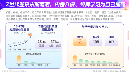 近几年初入职场的Z世代遇上了最困难的求职季,Z世代“裁员”甚至“应届生裁员”关注同比有较高增长。应届求职之外,Z世代毕业出路选择top5为考研、创业、考公、事业编和出国。职场人通过在职学习为自己加码,英语、考研、医考和大学公开课成为Z世代最常用的学习应用。