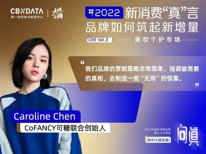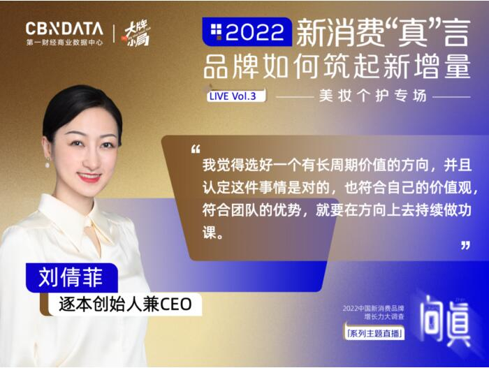 在此背景下,CBNData(第一财经商业数据中心)发起「向真」系列主题直播—美妆个护品牌专场内容对谈「2022新消费“真”言,品牌如何筑起新增量」 。我们邀请到逐本创始人兼CEO刘倩菲、CoFANCY可糖联合创始人Caroline Chen与应帆科技总裁王洋 ,从人群触达、用户运营、品类拓展、品牌构建等多方面入手,一起聊聊美妆个护品牌如何洞悉真实需求,筑起专属于自己的新增量。