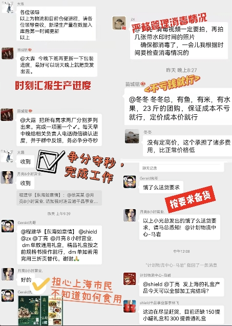 上午7:30直至凌晨,守“沪”工作群,已经开始了忙碌的计划与协调工作。计划物流部全力调配运输车辆制定物流及配送计划;品牌市场部多方面为上海市民考虑“担心上海市民不知道食材如何食用,在食材礼包中加入食谱”;销售部门“只要保住成本不亏就行”;生产部门“一定要注意保质保量,注意消毒。”