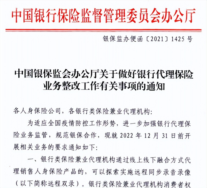 2022年初,为适应全国疫情防控工作形势,银保监会下发《中国银保监会办公厅关于做好银行代理保险业务整改工作有关事项的通知》,要求银行类保险兼业代理机构通过线上线下融合方式代理销售人身保险产品的,探索实施远程同步录音录像(即“远程双录”)。