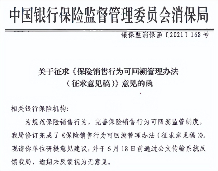 2021年6月,银保监会消保局发布《保险销售行为可回溯管理办法(征求意见稿)》,拟要求全国范围、全渠道、全业务、全年龄投保业务进行销售行为可回溯管理。